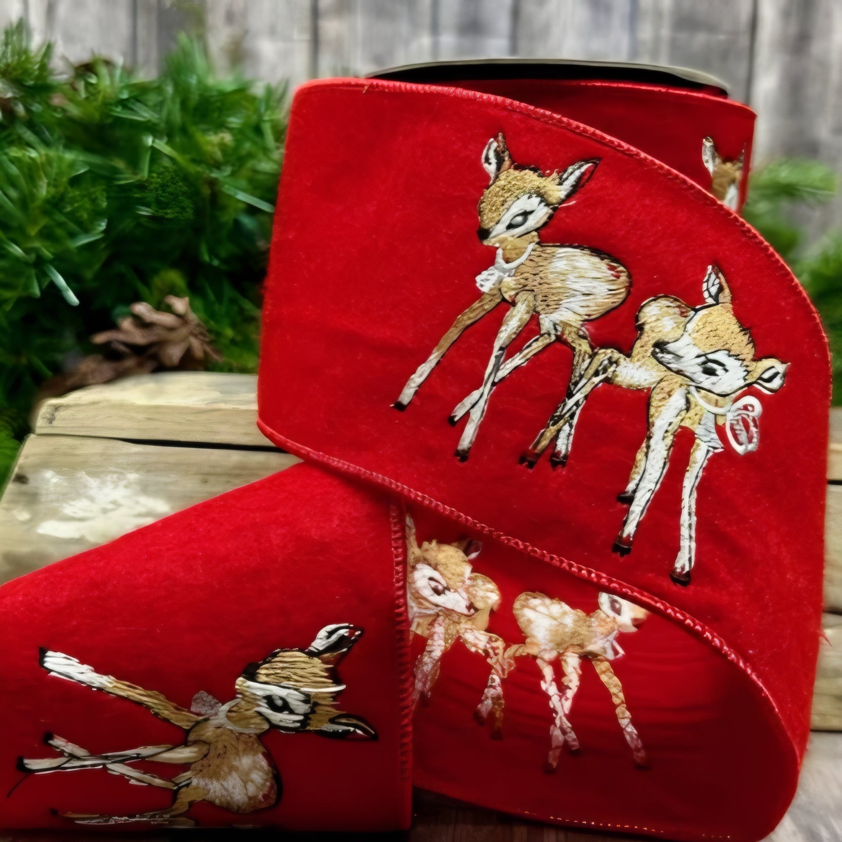 Capture the charm of the season with this red felt Christmas ribbon featuring delicate embroidered reindeer in a Bambi-inspired style. The soft felt texture paired with whimsical embroidery makes it ideal for cozy, rustic, or woodland-themed holiday decor. Wired edges offer structure for easy shaping on wreaths, trees, and garlands.
