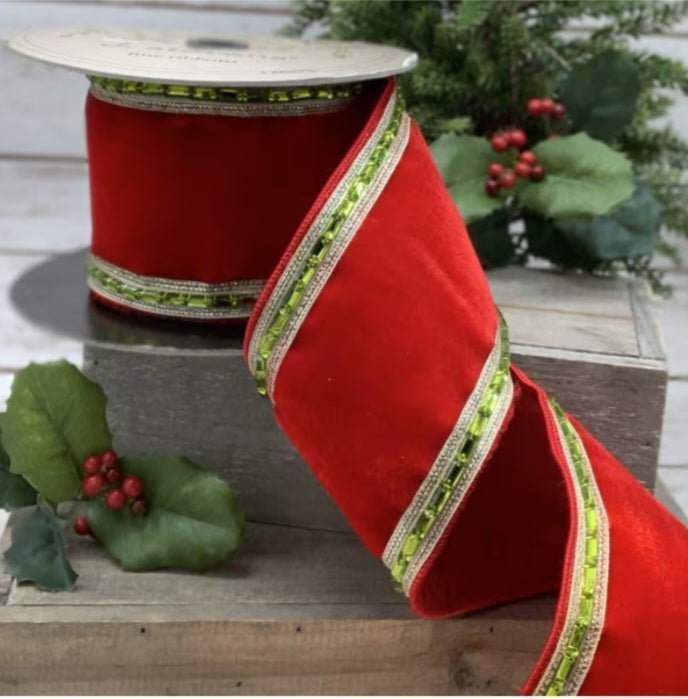 Red Velvet Christmas Ribbon with Green Beads- 4"